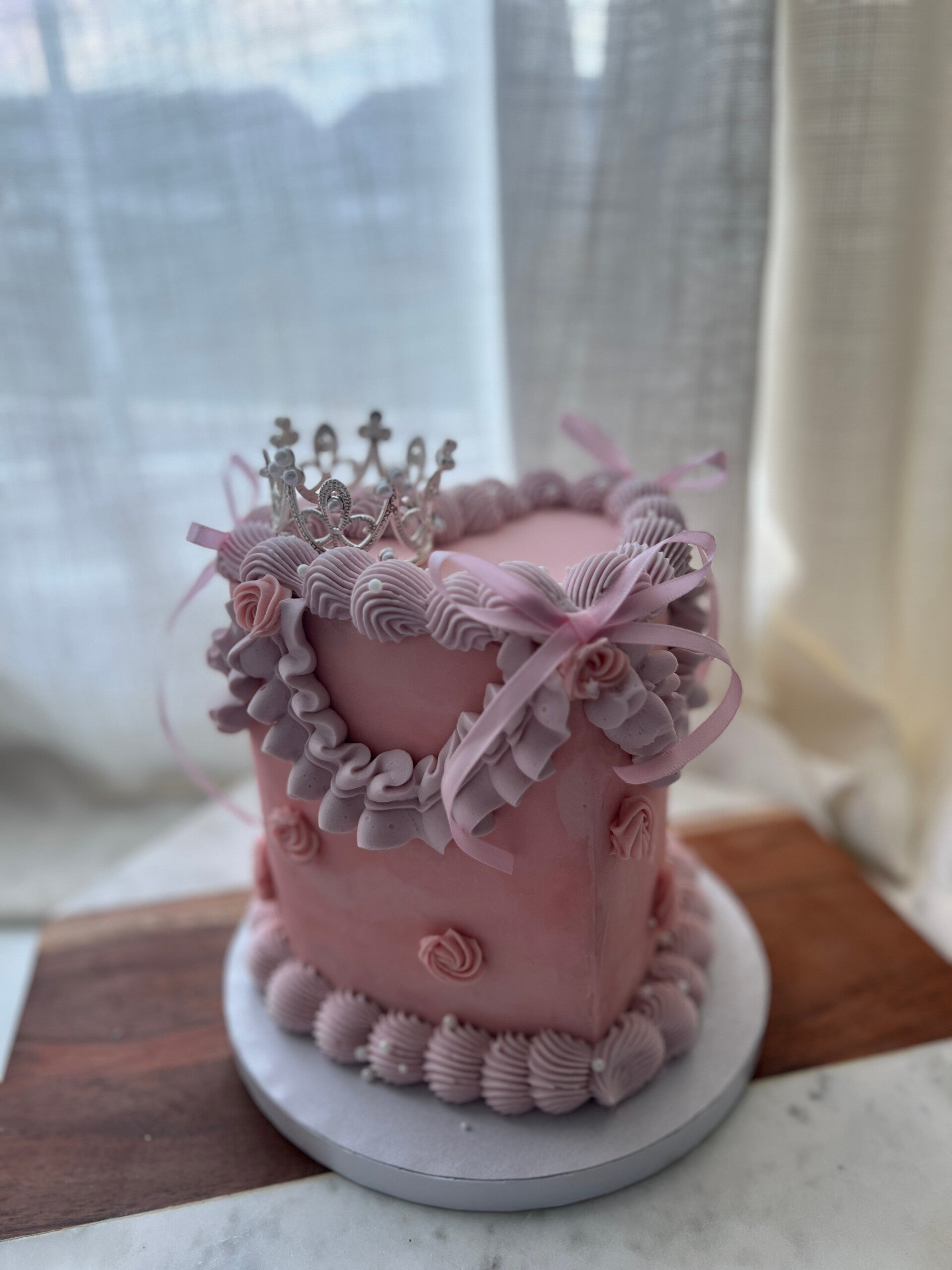 A 6" heart-shaped, 3-layer buttercream cake in our signature vintage style, featuring soft ruffles, bows, and optional crown topper. Available in vanilla or chocolate with limited color palettes. Optional writing available. Designed as shown for a timeless, romantic finish.